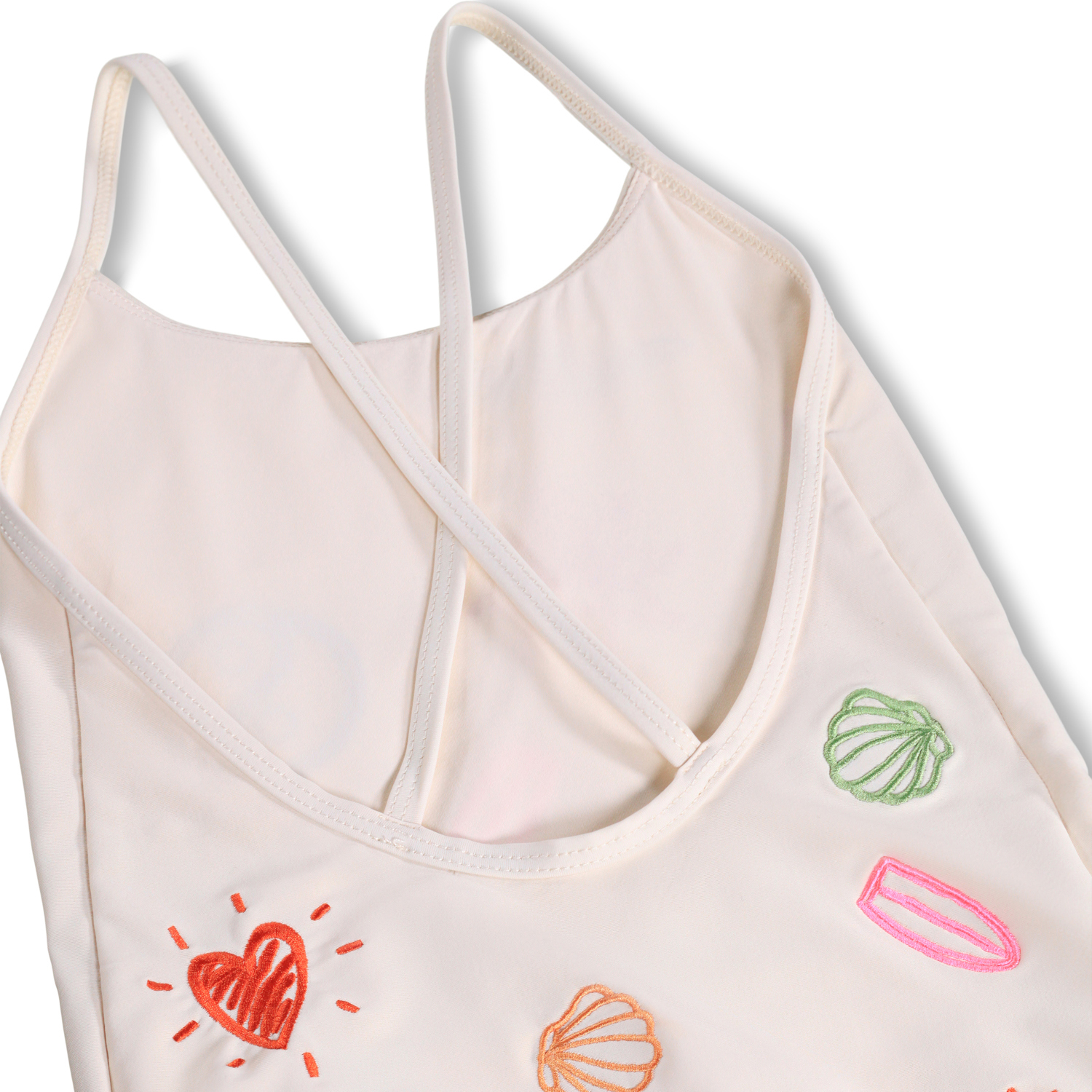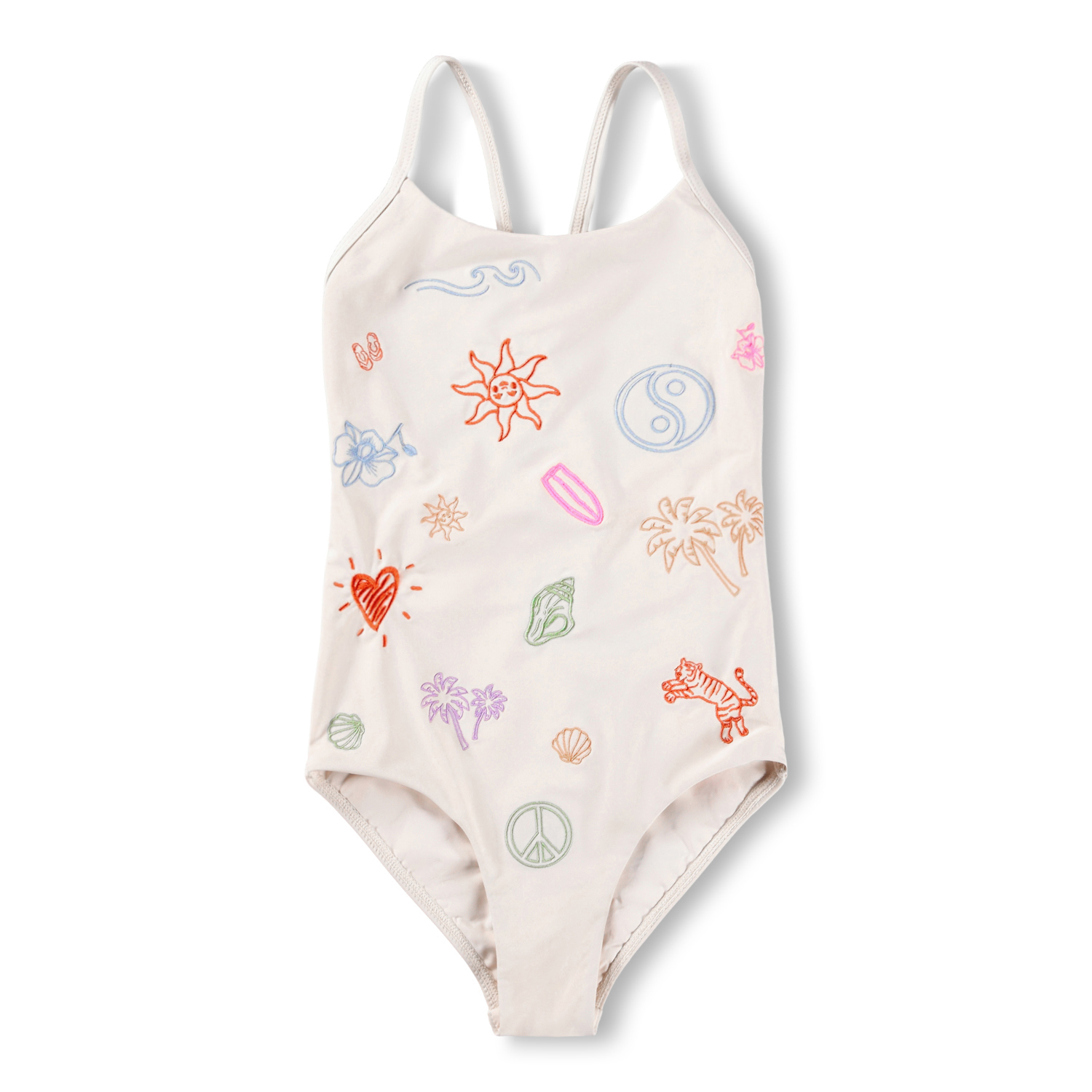 Ρομαντικό, αθλητικό και απόλυτα chic! Το ολόσωμο μαγιό Nanna της Molo σε καθαρό λευκό χρώμα στολίζεται με πολύχρωμα κεντημένα σχέδια, προσφέροντας μια μοναδική εμφάνιση που συνδυάζει την ποιότητα με την υψηλή προστασία.