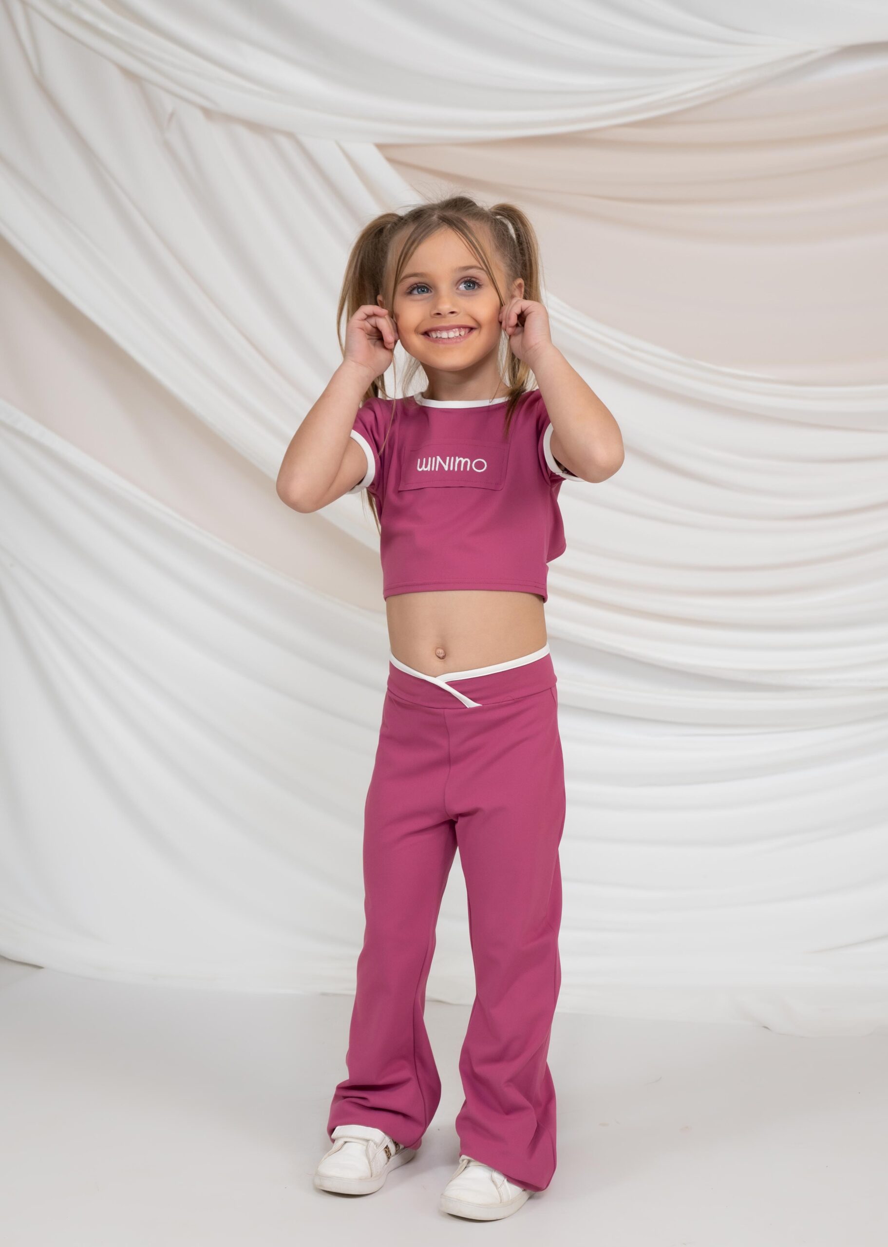 • Cut-Out Crop Top: Ένα μοναδικό τοπάκι με κοντό μανίκι, λευκές λεπτομέρειες στο τελείωμα και το λογότυπο “winimo” στο στήθος. Το “wow factor” βρίσκεται στην πίσω πλευρά, με ένα εντυπωσιακό τριγωνικό άνοιγμα (open back) που προσδίδει αέρα high-fashion.